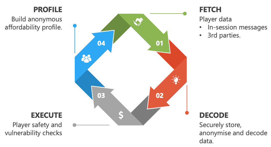 These data points are securely and anonymously stored within the Intelligent Profiling secure data servers and used to develop the affordability assessment and vulnerability scoring results. By capturing minimal data points at various time through the player lifecycle a full responsible gaming results set is developed.